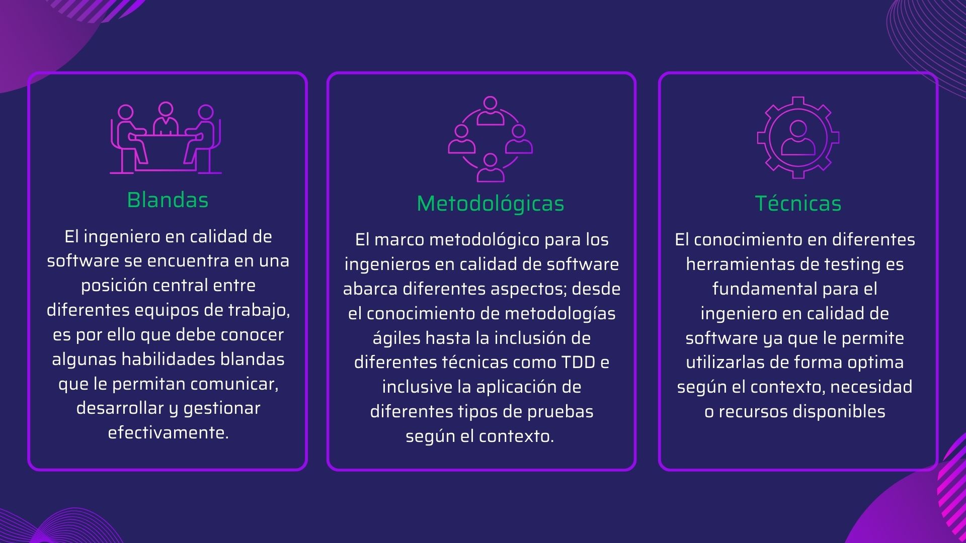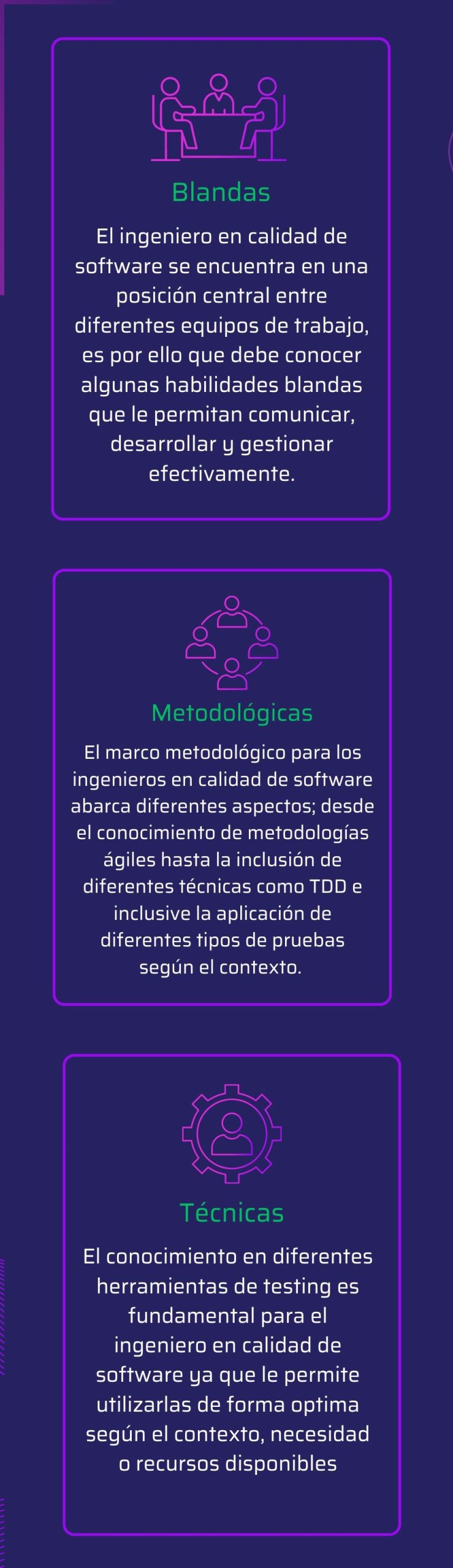 A continuación te presentamos un conjunto de habilidades que permiten construir un perfil actualizado y robusto para el cargo de Ingeniería en Calidad de Software. Hemos subdividido estas habilidades en 3 grandes dimensiones para un entendimiento claro y bien definido de las mismas.